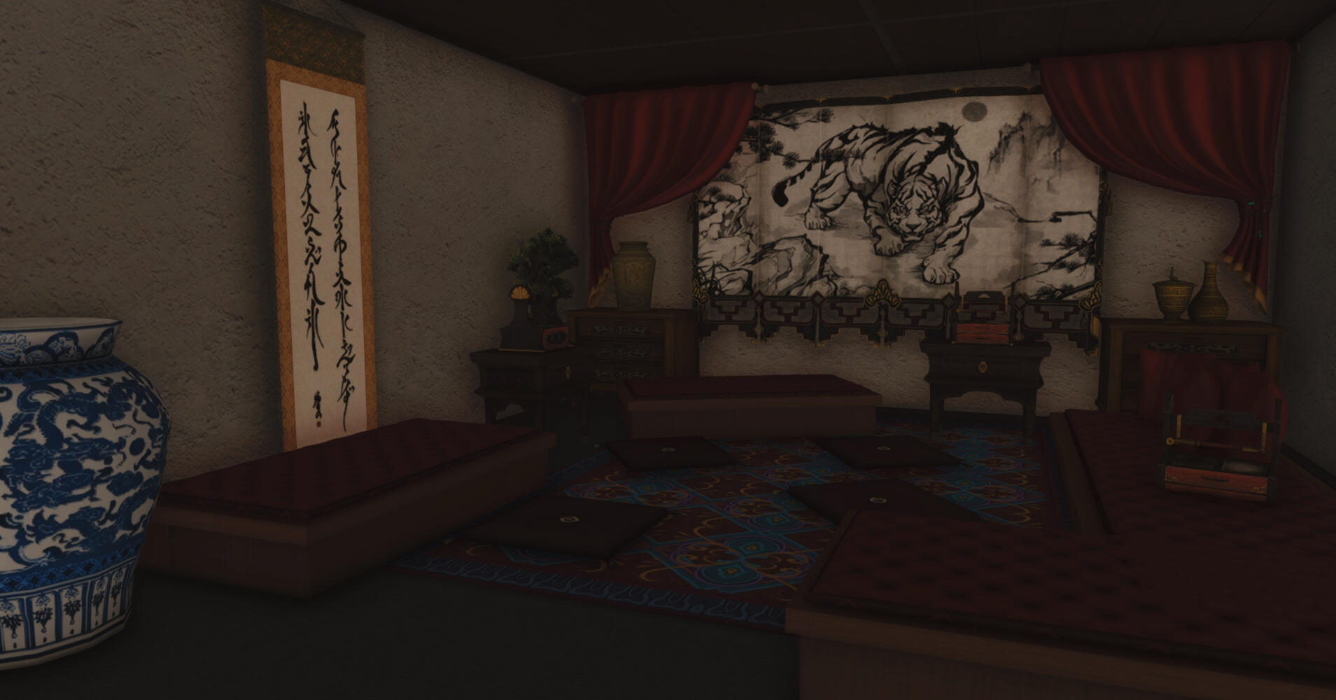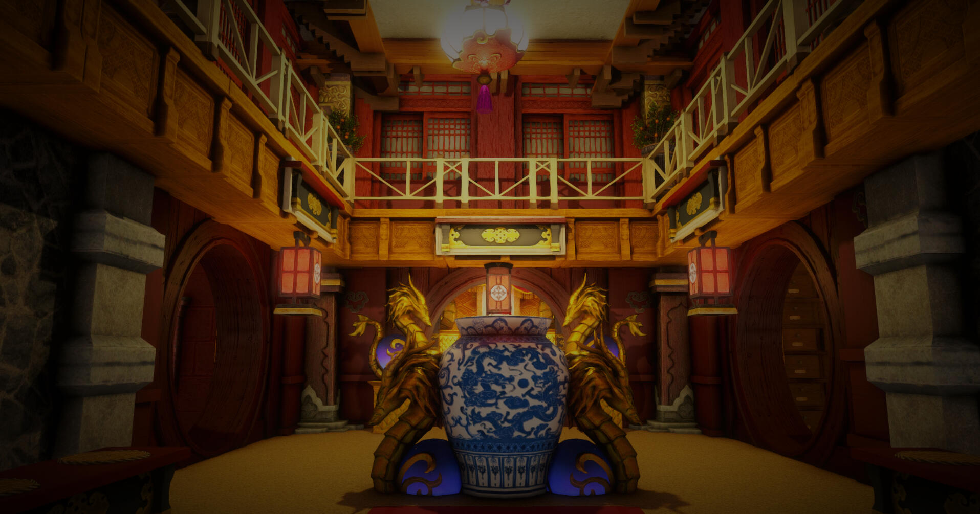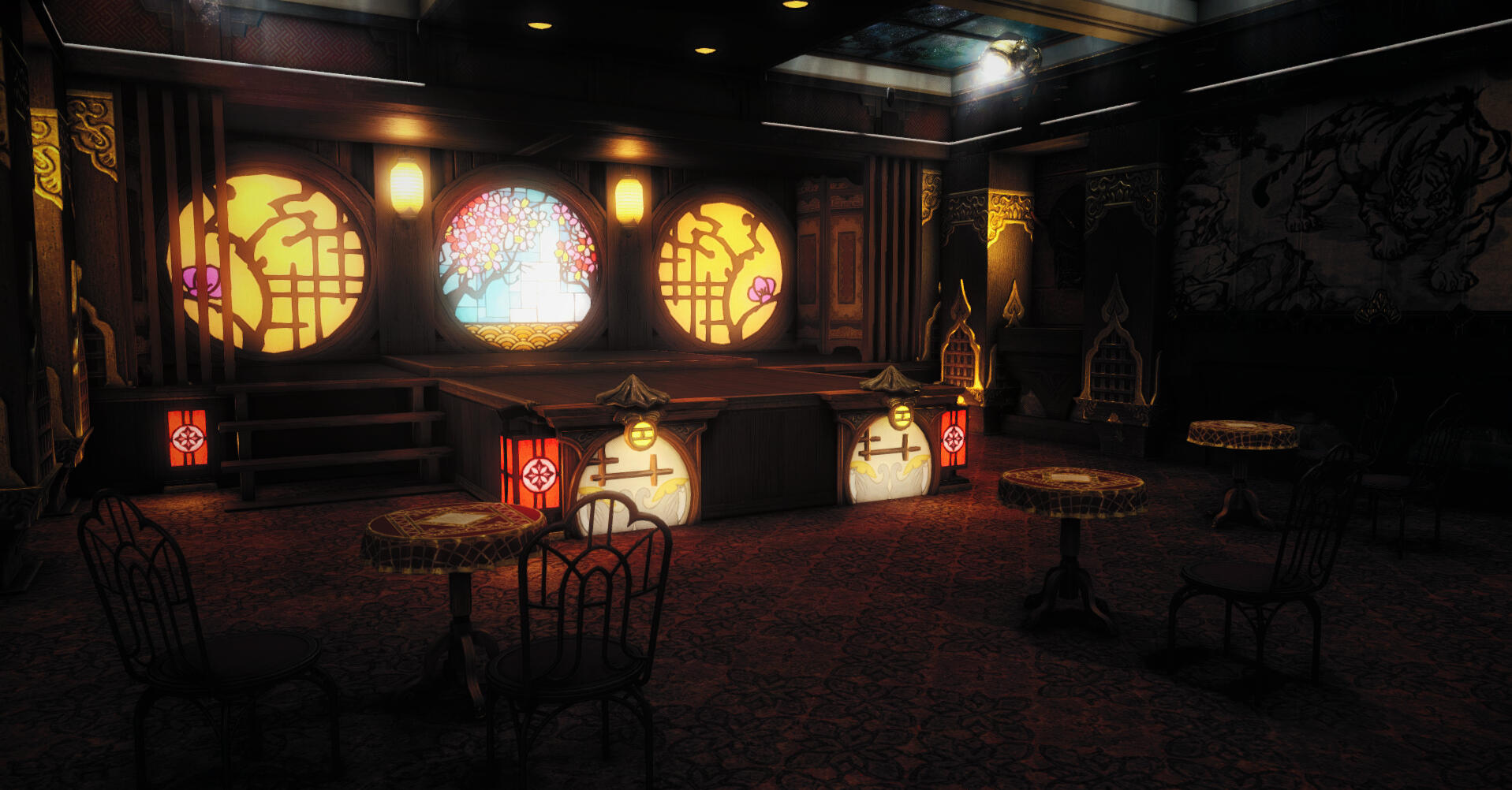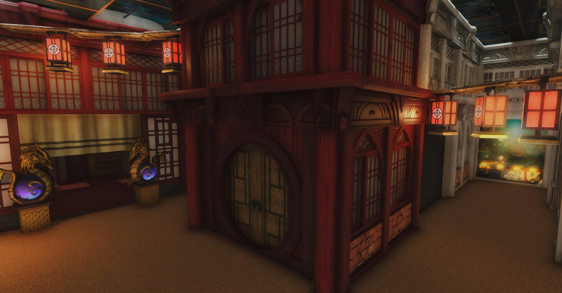 The main RP venue of the Wansui community is located in a large FC house whose interior decoration depicts the outdoor streets of the Wansui Bund as well as several interiors of the decadent businesses upon it.Due to the limited nature of indoor housing, this build does not represent the entire Wansui Bund, but instead depicts Moon Gate Road East, a section of the Bund under the control of the Tin Dei Wui Triad. However, it may be used as a stand-in for other parts of the Bund controlled by other gangs.The Wansui Bund FC house is located at Malboro, Lavender Beds, Ward 28, Plot 36.The businesses located within this build are listed below.