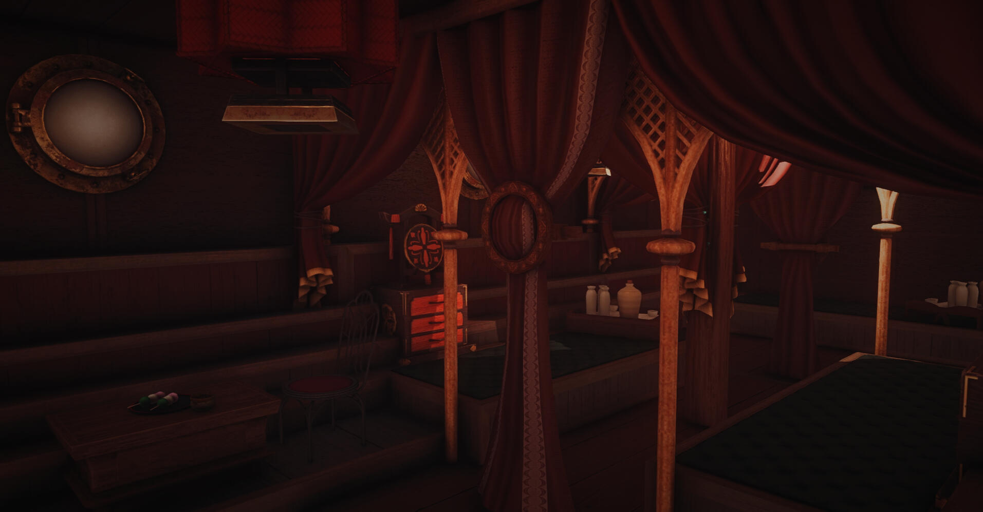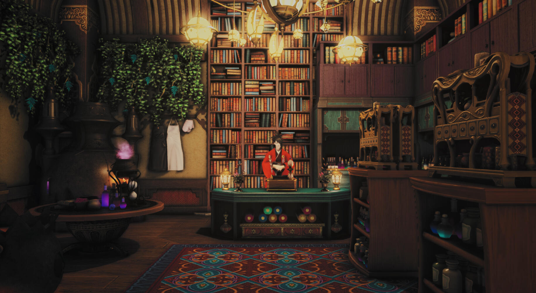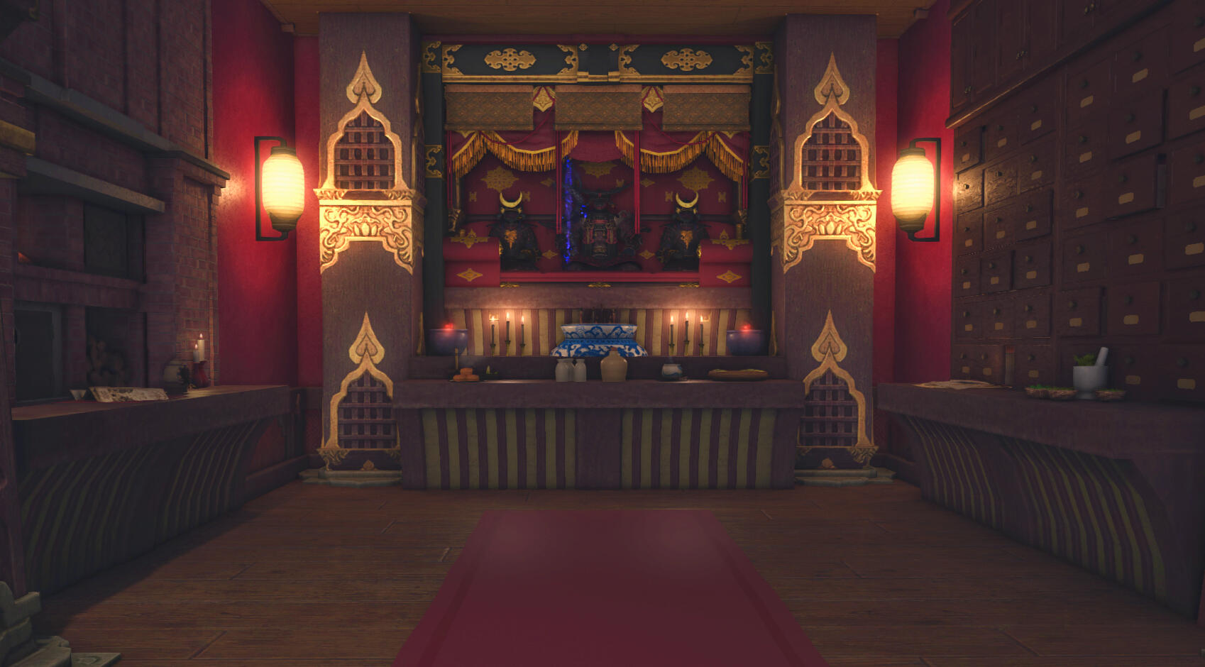 A smoking lounge offering a reprieve from the hardships of life, inviting visitors to partake of the relaxing smokes, lounge in rented attires and partake of food and drink from across the shores. Doman drink and food is naturally served as well.Separated between two floors lounges range from open to private, with some catering to Kugane's bold reds to simpler comfortable seating much closer to typical living in Doma.The Lily of the Other Shore is located in Diabolos, Topmast Wing 1, Room 16, Ward 29