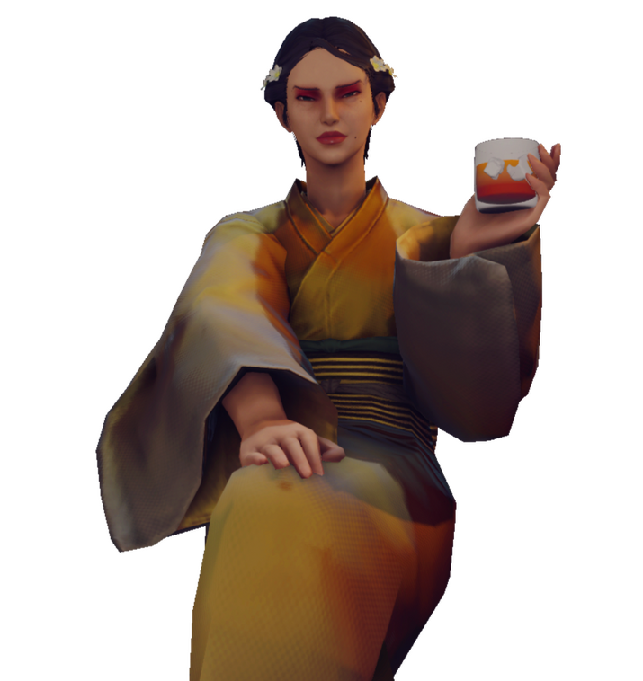 Ri'Xia is the owner and operator of 鞭炮 (Biānpào), a busy bar located within Wansui. Known to be an ally of the Tin Dei Wui, their movements within Kwan Tei most often follows that of the triad. Ri'Xia is most famous for the burning down of the Jade Hairpin while disguised as a lion-dancer's rear end. The first iteration of Biānpào was burned to the ground soon after, as retaliation by the gang. Having rebuilt from scratch, Ri'Xia's presence in Wansui comes with the same fire and passion as previously seen.